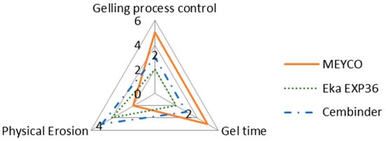According to Figure 12, MEYCO offers the greatest gelling process control and the longest gel time, when compared to the other two colloidal silica grouts. A longer gel time means that the grout can achieve longer penetration lengths, which also means that the grout can seal fractures to greater depths within the rock structures, but that grouting may have to be continued for longer, in order to avoid washout when the grout pressure is released. However, MEYCO showed the highest physical erosion out of the three grouting materials, whereas grouting with Cembinder results in the least erosion, with the values for Eka EXP36 lying in between. This suggests that in a natural environment where grout is in contact with groundwater, Cembinder and Eka EXP36 are more stable than MEYCO, in terms of silica erosion. The radar chart in Figure 12 provides a product overview in terms of the area of enclosure. Each of the three parameters scores a higher mark as the scale expands outward; hence, the larger the overall area, the better the overall grouting performance of each product. It is important to understand that the erosion experiments provide a performance comparison among the three grouts, though it does not necessarily reflect the full geodisposal scenario, where the groundwater velocity and other behaviours could vary.