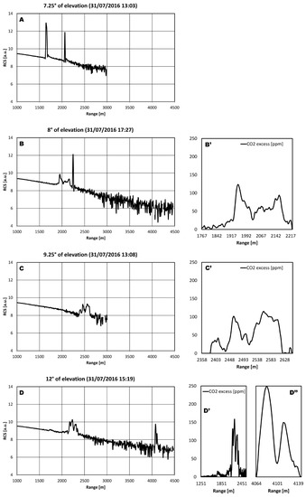(A) Lidar return at 7.25° of elevation: two narrow and defined peaks due to beam backscattering from rock faces are clearly visible (beyond 3000 m only noise was recorded and the corresponding signal is not shown); (B) lidar return at 8° of elevation: a wide and jagged peak from the volcanic plume and a narrow and defined peak from a rock face are clearly visible; the CO2 profile inside the volcanic plume is shown in (B’); (C) lidar return at 9.25° of elevation: a wide and jagged peak from the volcanic plume is clearly visible; the CO2 profile inside the volcanic plume is shown in (C’) (beyond 3000 m only noise was recorded and the corresponding signal is not shown); (D) lidar return at 12° of elevation: two wide and jagged peaks from the volcanic plume are clearly visible; the CO2 profiles inside the volcanic plume are shown in (D’,D”).