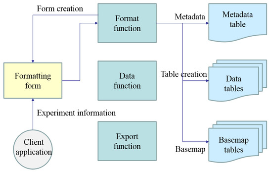 The sequence of the use case of the proposed framework is shown in Figure 4. The sequence consists of three steps: (1) Format creation; (2) Data input; (3) Export. These steps correspond to the workflow of a sensing experiment in Section 3.3; step (1) corresponds to step (A); step (2) corresponds to step (B); and step (3) corresponds to step (C).