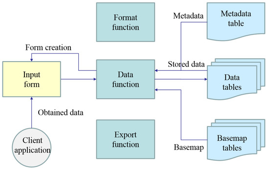 In the (B) Data-acquisition step, the user stores the obtained data using the client terminals. Figure 6 shows the data flow in this step. When the user selects a survey from the list of editable surveys, an input form is created by the data function. The data function creates it by reading the metadata from the metadata table. The stored spatial data are read from the data table of this survey and displayed on the basemap images. When the user obtains a datum in the field, the user stores it using the input form. The user plots the location on the map image and fills out the required fields for this data table. An image file can be uploaded if a corresponding web form is created. If the user selects the displayed datum, the stored values are displayed in the form and they can be updated or deleted. Multiple fieldworkers can share the latest result in real-time, because the displayed spatial data are refreshed when the input form is reloaded. If the network connection to the server is unavailable, the obtained data are temporarily stored in the memory of the client terminals. They are automatically uploaded to the server when the network becomes available.