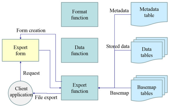 In the (C) Application step, the user displays and exports the stored data and uses them for the purpose of the experiment. Figure 7 shows the data flow in this step. When the user selects an experiment from the list of viewable experiments, an export form is created by the export function. The export function creates it by reading the metadata from the metadata table and the stored data from the data tables. The user can view the stored data on the basemap images. When the user requests to download the stored spatial data, the export module translates the spatial data to a file format.