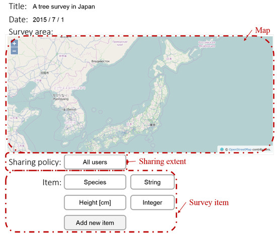 The user accesses the server and creates a format for the experiment in the (A) Preparation step. Figure 5 shows the data flow between the system components. When the user starts this step, the format function creates a formatting web form as a user interface. The user fills out the formatting form with the experiment information. The metadata, i.e., the title, date, and notes, are stored in the metadata table. The basemaps are selected from the basemap table and the study area is set using map images. If the user wants to add a new basemap, a new basemap file can be uploaded and stored in the database in advance. The survey items are added designating their name and data types, and a corresponding table is created as a data table. The proposed framework can be employed for various types of sensing experiments because any survey item can be added in this step. Then, the sharing policy of this format is selected.