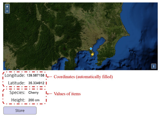 The participants walked around the study area and recorded the location and height of Kawazu-zakura trees based on visual observation. When the participants found a Kawazu-zakura tree, they opened the created format and input the obtained data. When the participants plotted a point on the map, the coordinate forms were automatically supplied with the point’s location.