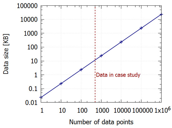 Figure 12 shows the relationship between the number of data and the data size stored in the system. The stored data consist of the point ID (4 bytes), coordinates (16 bytes), and height (4 bytes) per point. The data size increases in accordance with the number of data points. In this case study, 500 points data occupy 10 kilobytes in the system.