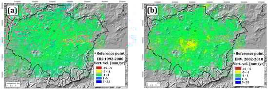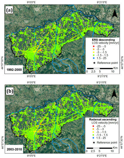 (a) Line of sight (LOS) velocity measured by the use of ERS-1/2 descending data (time interval from 1992 to 2000) and (b) RADARSAT ascending data (time interval from 2003 to 2010), modified from []. The reference points are also reported.