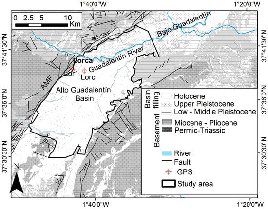 Geological setting of the Alto Guadalentín Basin modified from []. The localization of the Global Positioning System (GPS) stations, called Lor1 and Lorc, is also reported.