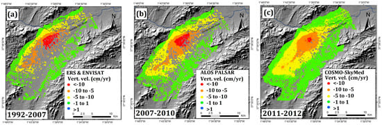 (a) Vertical velocity (Vert. vel.) measured by the use of ERS and ENVISAT data (time interval from 1992 to 2007); (b) ALOS PALSAR (time interval from 2007 to 2010); and (c) COSMO-SkyMed (time interval from 2011 to 2012).