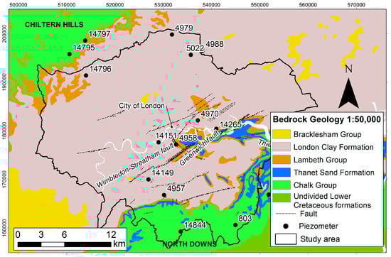 The Chalk Group is the principal aquifer in the London Basin supporting both public water and industrial groundwater use supply [,]. In the central area of the basin, the chalk aquifer is confined by the overlying Palaeogene formations. The chalk aquifer is recharged on the interfluves—in the Chiltern Hills to the north and North Downs to the south, where the Chalk outcrops and the aquifer becomes unconfined. The unconfined aquifer is characterized by larger seasonal water table variations, where fracture lineaments represent the main river drainage systems []. The lithological variations and the faulting on the chalk aquifer have a key control on the variability of the aquifer properties across the Thames Basin []. Historic overexploitation of the Chalk aquifer up to the 1960s led to widespread lowering of groundwater levels, reaching a depth of up to 90 m below sea-level in the central London Basin []. Thus, the Chalk aquifer became unconfined, leading to under-drainage and desaturation of the London Clay [,]. In the mid-1960s, Chalk groundwater level rapidly recovered at a rate of up to 3 m/year []. Therefore, an action plan was developed by the London Underground, Thames Water and the Environment Agency (EA) (i.e., the GARDIT, General Aquifer Research Development and Investigation Team) strategy to control groundwater recovery and re-saturation of the London Clay, that could potentially have negative impacts on the foundations of structures and infrastructure in the basin. Thus, the EA implemented an observation borehole network within the basin in order to monitor and manage changes in groundwater levels. Furthermore, an artificial recharge scheme was licensed in North London, NLARS (North London Artificial Recharge Scheme; []) to support the groundwater levels control [,].