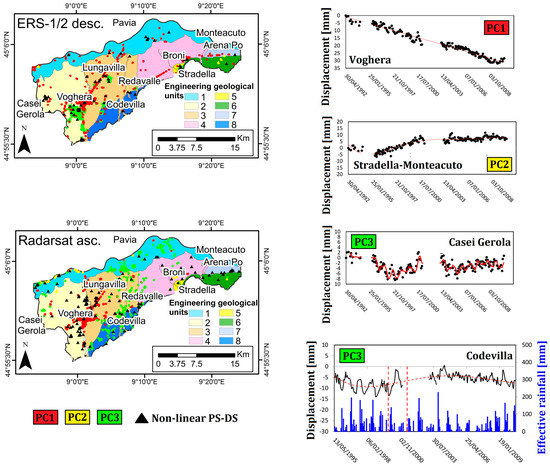 Ground motion areas detected using PC1, PC2, and PC3, and non-linear PS-DS of the ERS-1/2 descending and Radarsat ascending data overlapped on the engineering geological units. Time series (TS) of the deformational behavior detected at Voghera, Stradella–Monteacuto, Casei Gerola, and Codevilla are also reported. For Codevilla, TS were compared with effective rainfall measured at the Voghera weather station.