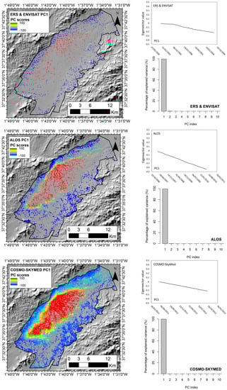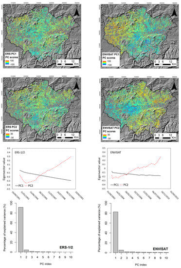 Principal component (PC) score maps of ERS and ENVISAT, ALOS, and COSMO-SkyMed data. For each dataset, the eigenvector value and the percentage of explained variance are also reported.