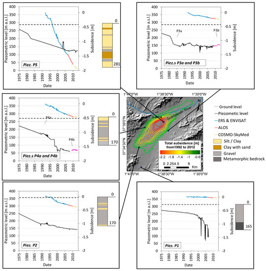 Furthermore, the cumulative displacement obtained by the use of the ERS-ENVISAT, ALOS PALSAR, and COSMO-SkyMed sensors in the period from 1992 to 2012 were computed (Figure 11). The maximum cumulative land subsidence reached up to 250 cm, with an average subsidence of 180 cm over an extension of 14.8 km2, located in the central sector of the Alto Guadalentín Basin (Figure 11). The areal extent of the subsidence exhibits a SW–NE elliptical shape parallel to the valley direction, showing an apparent deceleration trend over time. Cross-comparisons were performed between the groundwater level variations, the lithological data, and the displacement time series for five representative sites. Close to the piezometer P1, located in the southern zone, in which the highest groundwater drawdown (162 m) from 1992 to 2007 was measured, the cumulated land subsidence reached 13 cm in the period 1992–2012 (Figure 11). This evidence is linked to the absence of soft soils in the southern border of the basin []. In the western part of the basin, where the piezometers P2, P4a, and P4b are located, the soft soil thickness is moderate (from 18 to 21 m). Groundwater drawdowns between 31 and 107 m in the period 1992–2007 correspond to cumulative subsidence in the range of 38–48 cm during the period 1992–2012. Piezometer P2 gives insight into a steady lowering of the piezometric level from 1989 to 2013 (Figure 11) that is correlated with the steady subsidence rate. Otherwise, piezometers P4a–b, which are jointly analyzed due to their proximity and characteristics, exhibit a high groundwater level variability that is not in agreement with the estimated subsidence linear rate. In the eastern part of the basin, piezometers P3a–b display the piezometric level variations are in agreement with subsidence accelerations and decelerations. Thus, cross-comparisons between A-DInSAR time series and piezometric measurements have allowed the recognition of transient aquifer compaction due to piezometric lowering in the period 1992–2007 (Figure 11), which was followed by decelerations of the subsidence when piezometric recovery was observed until 2012. In the central part of the basin where the highest thicknesses of soft soils are found (approximately 190 m), the time series of piezometer P5 reveals a groundwater level recovery from 2007 to 2013 that does not correspond with measured subsidence steady rates (Figure 11). An inelastic, unrecoverable, and permanent deformation of this aquifer was observed, as previously reported []. This land subsidence mechanism was triggered by the groundwater exploitation beginning in the early 1970s.