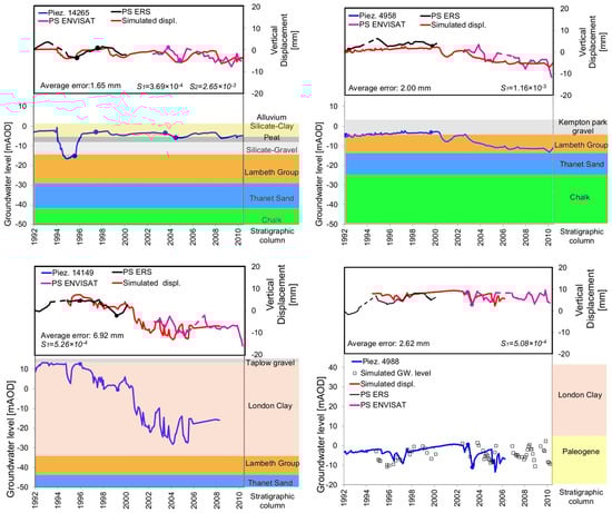 A-DInSAR time series were used to simulate the acceleration and deceleration of the displacement in response to the changes in the piezometric level across the London Basin. Figure 13 shows the simulated displacements at four piezometers in order to represent the main responses to hydraulic head changes. These are obtained by using the groundwater level data and the estimated storage coefficients as inputs to Equation (2).