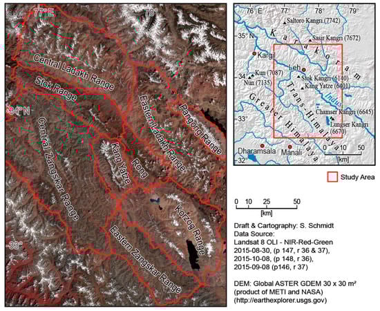 The study area is located in the upper Indus Basin [32], sandwiched between the Karakoram and Himalayan Ranges. It includes the Ladakh Range and the Pangong Range to the north of the upper Indus Valley and the ranges of Stok, Rong, Kang Yatze, Korzog, and Zangskar (between Kaltser and Tso Moriri) to the south of the Indus River (Figure 1). It covers an area of about 28,500 km2 ranging in elevation from about 2800 m in the lowermost sections of the Indus and Shyok Valleys to the highest peaks of about 6700 m a.s.l. (above sea level; all elevations are in m a.s.l.) in the Korzog and Pangong Ranges.