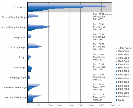 Separate analyses of the mountain ranges illustrate variations along the hypsographic curve, with increasing elevations towards the east. In the Eastern Zangskar, Korzog, and Pangong Ranges, elevation classes below 3800 m do not exist and more than 40% of the mountain ranges are higher than 5200 m; whilst at the other end of the hypsographic distribution, the mountain ranges of Stok and Central Zangskar show only 8% and 18% of area above 5200 m, respectively.