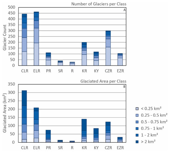 Number of glaciers (A) and glaciated area per size class (B) in the subregions (CLR: Central Ladakh Range, ELR: Eastern Ladakh Range, PR: Pangong Range, SR: Stok Range, R: Rong Range, KR: Korzog Range, KY: Kang Yatze Range, CRZ: Central Zangskar Range, EZR: Eastern Zangskar Range).
