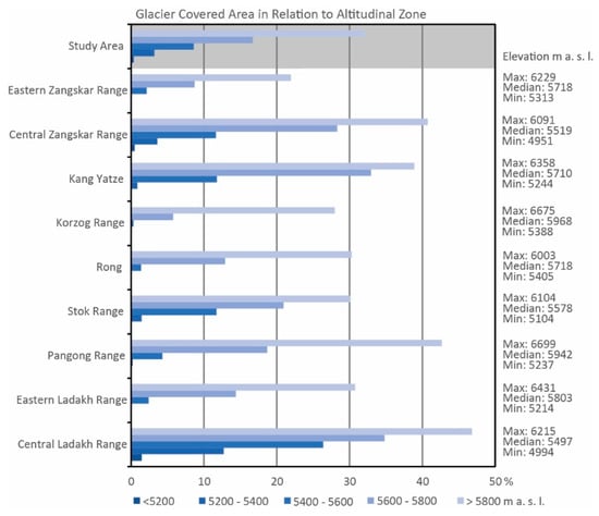Overall, the glaciers of Ladakh are characterized by their high altitudinal termini, with 91% of them situated above 5200 m. In comparison, the minimum altitude of the debris-covered Siachen Glacier, located in the upper Shyok Valley of the eastern Karakoram, reaches approximately 3570 m. However, in the Central Zangskar and Central Ladakh Ranges, about 20% and 24%, respectively, of the glacier tongues stretch down to elevations below 5200 m, whereas in the adjacent Stok Range, about 8% reach this elevation. In all other regions, the glaciers end above 5200 m and even in the Korzog and Rong Ranges above about 5390 m. In all mountain ranges the percentage of glaciated area increases with altitude; the Central Ladakh Range and the Pangong Range showing their maximum above 5800 m with 47% and 43%, respectively (Figure 4).