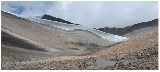 Terminal moraines of the Golep Glacier (left) and an unnamed glacier (right) of the Stok Range in 2008 (the orange point in Figure 10 marks the camera position).