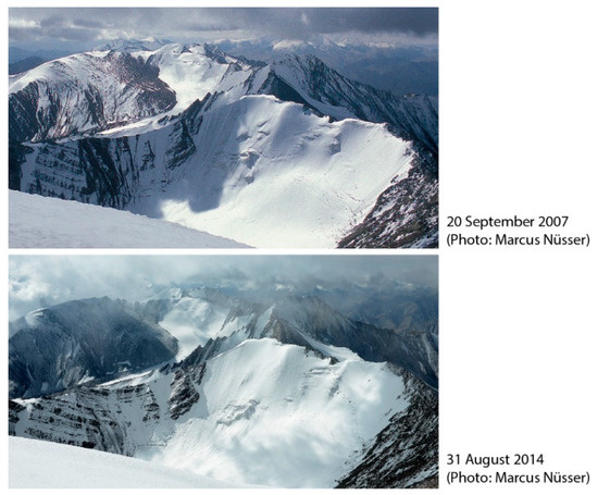 Upper catchment of the Stok Glacier seen from the summit of Stok Kangri (6140 m) with the Golep Kangri (5900 m) in the background in 2007 and 2014 (the yellow point in Figure 10 marks the camera position).
