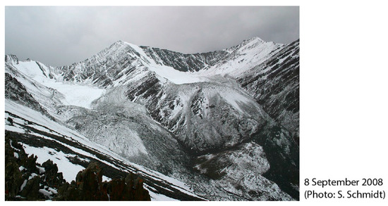 The semi-arid climate of Ladakh is caused by the rain shadow effect of the Karakoram and Himalaya. Mean annual precipitation of the upper Indus basin decreases from west to east and south to north [33]. In the main administrative center of Leh (3506 m), located in the Indus Valley, mean annual precipitation amounts to approximately 100 mm [34]. Roughly one third of the total annual precipitation is associated with westerly disturbances occurring between December and February [31]. As in the adjacent Karakoram, slope wind circulation may result in significant underestimation of precipitation [35]. The denser cover of grasses and dwarf shrubs at higher altitudes also suggests a vertical gradient in precipitation [36,37]. The dominant input of snow into the glacial system occurs in winter, but precipitation may fall as snow at higher altitudes throughout the year. Our own observations, remote sensing data, as well as observations by other research groups [36] confirm regular summer snowfall at altitudes above 5000 m, resulting in increased surface albedo and reduced ablation of snow and ice. Mean monthly temperatures in Leh range from −7.2 °C in January to 17.9 °C in July. Mean annual temperature was 5.6 °C during the period from 1951–1980 [34], which is unusually high for these elevations [38]. Due to low mean annual air temperatures and low annual precipitation, the glaciers in Ladakh are of a continental type [39]. The existence of lakes on and beside these glaciers, causing several glacier lake outburst floods [40,41], indicate their polythermal character.