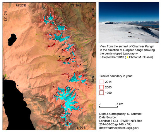 The 2007 IPCC (Intergovernmental Panel on Climate Change) report predicted that by 2035 the Himalayan region would be ice-free [1]. This erroneous forecast initiated a huge interest in regional glacier studies [2,3,4]. In contrast to often simplified assumptions of general and mostly rapid glacier retreat, recent studies show a more complex and spatially differentiated pattern of retreat, stability, and advance. Climatic differences between monsoonal and cold-arid regions account for another uncertainty in general trends of glacier change at the Himalayan scale [5,6,7,8,9]. Whereas the majority of glaciers in the monsoonal portions of the central and eastern Himalaya, between Himachal Pradesh in the west and Bhutan in the east, are receding at different rates [10], changes are less pronounced in the western Himalaya [11,12,13,14] and in the adjoining Karakoram [15]. Some Karakoram glaciers have advanced since the 1990s [16,17,18,19] or have been in balance since the 1970s [20]. This suggests that the Trans-Himalayan region of Ladakh is likely to be located at the interface between decreasing and increasing glaciers.