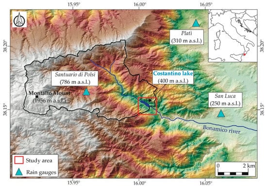 The Costantino landslide dam is located in the Bonamico basin along the Arco Calabro-Peloritano in the Southern Ionian side of Calabrian territory, Southern Apennines (Italy) (Figure 1). The Bonamico is a typical Mediterranean basin: it has a maximum altitude of 1956 m a.s.l. (Montalto Mount, Figure 1) and a mean altitude of about 780 m a.s.l. The high relief energy is due to the tectonic uplift during the Pleistocene. The length of the main river channel is 29.68 km with a mean gradient of 6% [42]. Although the basin has a total area of about 137 km2, its upper part (subtended by the Costantino landslide dam) covers an area of about 100 km2. The Bonamico basin, as most basins in Calabria territory, show intense hydraulic and geomorphological dynamics. From a geomorphological point of view, the Bonamico River is a fiumara, a braided river with high gradient, delimited by very steep slopes and characterized by coarse-grained alluvium [43,44]. The hydraulic regime of fiumara is typically torrential, with the predominance of debris production by mass-movement and erosion on slopes. For these reasons, the transport capacity of fiumara torrents is very high. According to the landslide map proposed by [45], the upper part of the basin is characterized by the presence of more than 20 landslides.
