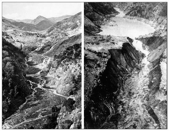 Photos taken immediately after the landslide events of January 1973. On the left the Bonamico river valley, on the right the diffuse erosion along the Costantino Lake outflow and on the landslide dam body. Photos taken from [49] (used with permission of the copyright holder).
