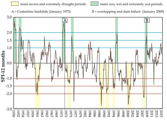 Twelve-month SPI calculated from meteorological data of Platì station. The SPI computation was carried out with DrinC software [63].
