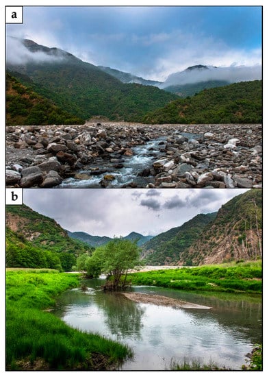 - methods and criteria for the prediction of the dam formation and break [2,13,18,19,20,21,22], even with the introduction of indexes related to the dam break hazard, based on morphological parameters [10,20,23,24,25,26,27];