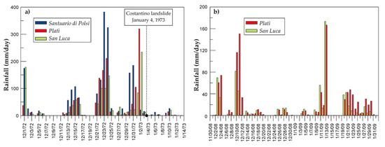 Daily rainfalls registered by the available rain gauges during: (a) the occurrence of the Costantino landslide in January 1973; (b) the overtopping/dam failure in December 2008–January 2009.