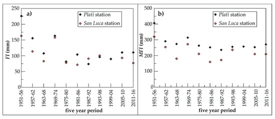 (a) Fournier index (FI); and (b) modified Fournier index (MFI) for Platì and San Luca stations, five year by five year, starting from 1951.