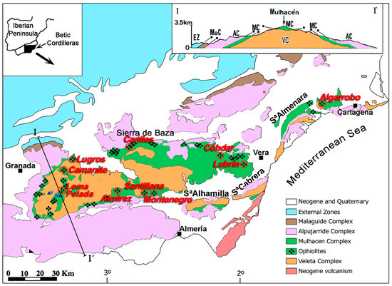 Geological sketch map of the central-eastern sector of the Betic Cordilleras, showing the relationships between the Veleta, Mulhacén and Alpujárride metamorphic complexes and the post-orogenic volcanic and sedimentary formations, modified from Figure 1 in Puga et al. [19]. The upper inset shows a simplified version of the present tectonic relations of the Nevado-Filábride complexes, with Veleta (VC) beneath and Mulhacén (MC) on top, on which the Alpujárride (AC) and Maláguide (MaC) complexes and the External Betic Zones (EZ) are superposed. Black four-pointed stars represent the largest outcrops of the BOA located along the MC of the Nevado-Filábride Domain. Red encircled stars indicate the location of the main ophiolitic outcrops from which most of the studied rocks, considered in this revision, derive. The studied outcrops are the following sites: Lugros, Camarate, Loma Pelada, Almirez, Santillana and Montenegro (in Sierra Nevada), Cóbdar and Lubrín (Sierra de Filabres), Algarrobo (Sierra del Algarrobo) and Caniles (Sierra de Baza). Letters V and M in blue, in the western area of the map, indicate the approximate geographic setting of the Veleta and Mulhacén Pics.