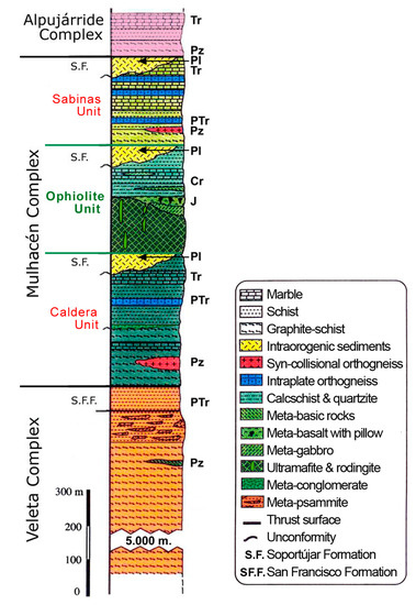 Simplified lithostratigraphic column showing the main rock types of the different tectonic units and formations making up the Veleta and Mulhacén Complexes, together with the lithostratigraphy (not to scale) of the overlying Alpujárride Complex, modified from Puga et al. [19]. The main lithologies forming the different tectonic units and formations are represented in Figure 2 by different screens and colors, whose meaning can be seen in the legend of this figure. Abbreviations on the right border of Figure 2 have the following meaning, Pz: Palaeozoic, PTr: Permian-Triassic, T: Triassic, J: Jurassic, Cr: Cretaceous, Pl: Paleocene, and indicate the radiometrically dated ages, or the geologically more probable ages.