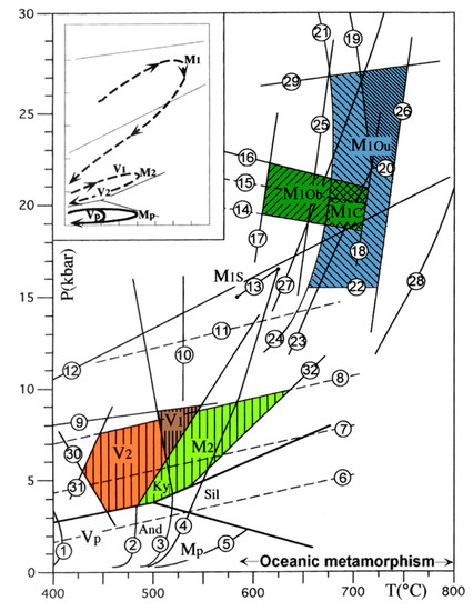 The P-T trajectories shown in the upper inset of Figure 4 represent the temporal evolution of the orogenic metamorphism in the BOA, and other MC rocks, from the eclogite facies, with the peak P-T conditions approximately represented by M1, which were followed by Ab-Ep amphibolite and greenschist facies conditions, with a peak P-T conditions represented by M2. The more precise P-T conditions for the BOA rocks in these successive stages of alpine metamorphism are represented in Figure 4, into the eclogitic fields M1Ob and M1Ou, for basic and ultramafic rocks, respectively, and into the M2 field showing the conditions for the later partial transformation of eclogites into Ab-Ep amphibolites. A more precise explanation of the reactions selected to delimitate the successive metamorphic field conditions attained in the BOA rocks and in the other units forming part of the MC and VC can be seen in Puga et al. [10,11,13].