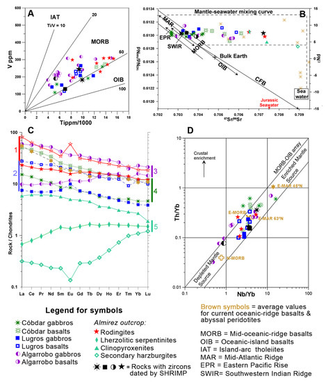 Distribution of scarcely mobile trace elements (A), or their ratios (D), REE values normalized to chondrites (C) and isotopic ratios of Sr vs. Nd (B) of the different lithologies forming the Betic Ophiolites compared with MORB, OIB and IAT basic magmas, modified from [19] in order to include the following outcrops: Cóbdar, Lugros, Algarrobo and Almirez. (A) Ti/1000 vs. V diagram (Shervais [45]); (B) Nb/Yb vs. Th/Yb diagram (Pearce [46]); (C) Chondrite-normalised REE diagram for basic and ultramafic rocks, using normalising values of Boynton [47]; (D) 87Sr/86Sr vs. 143Nd/144Nd isotope correlation diagram for basic and ultramafic rocks of the Betic Ophiolites, compared with abyssal peridotites (data from Snow et al. [48]); dashed lines showing mantle–seawater mixing curves for the abyssal peridotites are also reported by Snow et al. [48]); Sr and Nd isotopic values for EPR (Eastern Pacific Rise), MAR (Mid-Atlantic Ridge), SWIR (South Western Indian Ridge) and OIB values (Oceanic Island basalts) from Hoffman [49] ; CFB values (Continental flood basalts) from Marzoli et al. [50]. Note that in Figure 5A,B,D, are also plotted, with black color, the rocks radiometrically dated, deriving from each of the four selected outcrops, to show the chemical similarity between the dated rocks and the other rocks from the same outcrops.