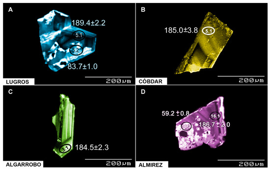 The cathodoluminescence images (CL) of four selected zircons from Lugros, Cóbdar, Algarrobo and Almirez outcops, are shown in Figure 6. The CL photos show three main microstructures in the studied zircons: (i) some crystals with idiomorphic rims and oscillatory zoning, which indicate the igneous origin of the zircon domains, together with (ii) locally recrystallized domains, which do not preserve the oscillatory zoning, probably due to oceanic-floor recrystallization processes, and (iii) crystal sectors presenting whitish color and clouded irregular forms that surround small rounded empty spaces (black in the CL photos). The latter bright and irregular crystal domains have been interpreted (by Puga et al. [15,19]) as developed during a fluid-assisted recrystallisation process of the zircon areas originally surrounding micropores that were previously filled by fluid inclusions. In the zircon crystal from Lugros (Figure 6A) these recrystallized whitish areas yield an age of Upper Cretaceous (83.7 ± 1 Ma), while the oscillatory zoned rim of the same crystal yield an igneous age of Lower Jurassic (189.4 ± 2.2 Ma); in the Almirez zircon crystal (Figure 6D), with igneous age of 186.7 ± 2 Ma, the recrystallysed area, surrounding a micropore, yield a Paleocene age (59.2 ± 0.8 Ma). This range of recrystallization ages from Upper Cretaceous to Paleocene would correspond to the Eo-Alpine metamorphic stage, which affected these rocks in eclogite facies conditions, during the subduction of the oceanic floor from which the Betic Ophiolites derive (Table 1).