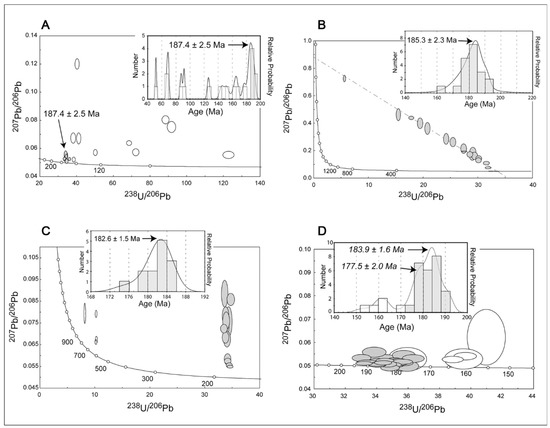 Tera-Wasserburg diagrams and probability histograms with mean ages for the dated zircons of four samples from Lugros (A), and Almirez (D) outcrops, according to [19], complemented with samples from Cóbdar (B) and Algarrobo (C).