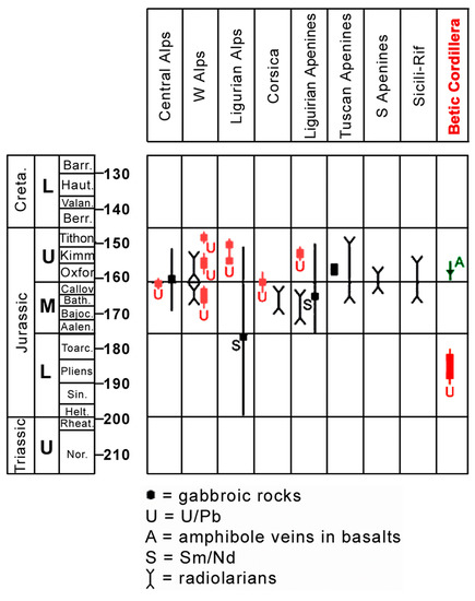 The MOR-type ophiolites found at different locations in the Alps and Apennines (Figure 8) were dated using different radiometric techniques, of which the most reliable for inferring the age of magmatism are Sm/Nd and especially U/Pb applied to zircons from gabbros, complemented with dating of radiolarians preserved in the sedimentary sequences of some poorly metamorphosed ophiolites. Figure 8, by Bortolotti and Principi [66], shows the results of this dating and the techniques used on the ophiolites from each location. Some of the radiometric dating of Betic Ophiolites (shown in Table 1), coming from: Lugros, Almirez, Cóbdar and Algarrobo outcrops (Figure 1), which form part of the Ophiolite Unit of the MC, in the Nevado-Filábride Domain, have been also included in Figure 8 as Betic Cordillera for comparison.
