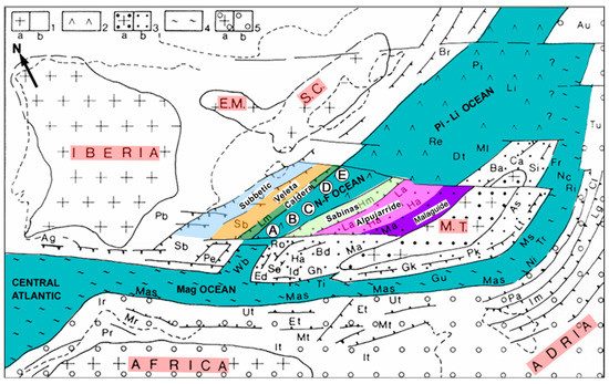 Figure 10 shows the palaeogeographic reconstruction for the Early Cretaceous of the central-western area of the Mediterranean by Guerrera et al. [8], with slight modifications. In this figure, N-F Ocean indicates the area of oceanic floor where the BOA rocks, described in this paper, could have originated SE of the Iberian-European margin for the original paleogeographic continental domains of the tectonic units within which these ophiolites were intercalated. From West to East we have coloured the bands indicating the location of the following Mesozoic Betic Domains: the Subbetic margin, the VC, and the different original domains corresponding to the continental tectonic units forming part of the Mulhacén Complex: Caldera and Sabinas. These two latter units would correspond to both continental margins of the Betic Ocean, or Nevado-Filábride Ocean. The relative provenance of some Betic ophiolitic outcrops is indicated by the letters A to E, according to their current geographical location and differential petrologic and geochemical peculiarities. These characteristics, which are mainly shown in Figure 5D, suggest a probable origin of Cóbdar (D) and Algarrobo (E) outcrops closer to the western continental margin of the Jurassic Betic Ocean than those of Lugros (A), Almirez (B) and Caniles (C) outcrops. Moreover, eastwards the corresponding domains of the Alpujárride (AC) and Maláguide (MaC) Complexes are represented, as well as the emerged areas of the Mesomediterranean Terrane (MT) in the early Cretaceous. According to this reconstruction, at the start of the Cretaceous, the Betic Ocean could have connected the Piemontese-Ligurian (Pi-Li) and the Maghrebian (Mag) Oceans with the Central Atlantic Ocean.