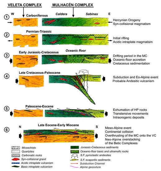 The oceanic lithosphere from which the Betic Ophiolites derived was formed in episode 3 by asthenospheric rise, under extensional conditions that persisted throughout the Jurassic and Cretaceous, along a rifting zone on the continental crust of the MC, located between the Caldera (W) and Sabinas (E) units. Among other Pre-Alpine metamorphic rocks, this continental crust contained orthogneisses derived from Hercynian syn-collisional granits (red color) and Permian-Triassic intra-plate rhyolites (blue color) formed earlier in episodes 1,2. In episode 4, the Jurassic-Cretaceous oceanic floor, and part of its continental margins, were subducted toward the SE as a result of a first convergent movement between of the Iberian-European and African-Adria plates beginning in the Late Cretaceous, which caused the Eo-Alpine metamorphism in eclogite facies conditions (Table 1). Genetically related to this subduction episode there are only scarce magmatic products, mainly represented by pyroclastic andesites which, melanged with continental carbonates and gypsum deposits, would gave origin to the Soportújar Formation (SF) ([13] and Figure 2). During episode 5 a small part of the subducted rocks, metamorphosed at depths from 50 up to more than 100 km ([10,11] and Figure 4), were exhumed as tectonic slabs, onto the Caldera domain (its western continental margin), forming the Ophiolite Unit, which was also overthrusted by the Sabinas unit (its eastern continental margin) and by the SF, forming an initial stacking involving the three units of the MC and probably also of the MC onto the VC. During this compressive episode, the Meso-Alpine metamorphic event developed, affecting both complexes in Ab-Ep amphibolite facies conditions during the Paleogene (Table 1). Finally, episode 6 took place along the Neogene, during which the Alboran microplate, dismembered from the western part of the Mesomediterranean Terrane, was displaced to the SW, where the metamorphic Internal Zones emplaced on top of the External Zones of the Betic and Rift domains and underwent, together with them, the continental collision between the Iberian and African plates. This collision originatedthe Neo-Alpine metamorphic event, (mainly developed in greenschist facies conditions in the MC and VC), which was followed by the overstacking of the Alpujárride and Maláguide onto the previously empiled Nevado-Filábride Complexes.
