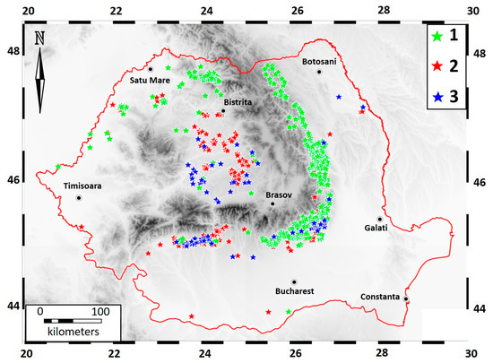 - Geological Institute. Geological Map of Romania, 1:1,000,000; Geological Institute of Romania: Bucharest, Romania, 1967. [Google Scholar]