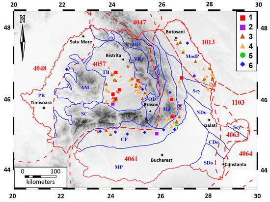 Distribution of the active and inactive seeps included in the HYSED-RO database in relation to the geologic provinces defined by the USGS (red dashed lines and numbers [45], and with the main structural units of Romania (blue lines and acronyms) [48]. 1013: Ukrainian Shield; 1103: Dobrogea Foreland; 4047: North Carpathian Basin; 4048: Pannonian Basin; 4057: Transylvania; 4061: Carpathian-Balkanian Basin; 4063: Dobrogea Orogen; 4064: Western Black Sea Basin; PB: Pannonian Basin; TB: Transylvanian Basin; AM: Apuseni Mountains; SC: Southern Carpathians; VR: Volcanic Range, MD: Median Dacides; OD: Outer Dacides; Md: Moldavides; ModP: Moldavian Platform; Scy: Scythian Platform; NDo: North Dobrogea; CDo: Central Dobrogea; SDo: South Dobrogea; MP: Moesian Platform; 1: active gas seep; 2: inactive gas seep; 3: active mud volcano; 4: inactive mud volcano; 5: active oil seep; 6: active hydrocarbon bearing spring.