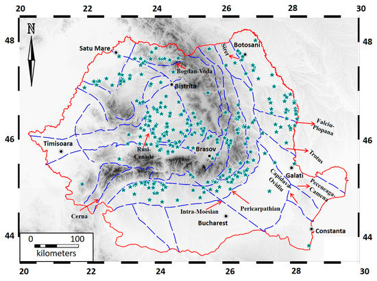 The distribution of seeps is in agreement with the occurrence of petroleum plays, and depends on the tectonic features of the areas of interest. In order to better understand the distribution of the seeps, HYSED-RO was implemented in a GIS interface, using MapInfo Professional V. 11 (Pitney Bowes Software, Troy, NY, USA). The layers used in the evaluation of the seep occurrences are: the geological map of Romania 1:1,000,000 [45], a Digital Elevation Model (DEM) of Romania, the map of the geologic provinces in Romania [46] (Figure 2 and Figure 3), and the geothermal map of Romania [47]. The maps were digitized and geo-referenced in WGS84 Latitude and Longitude projection. The seeps have been categorized according to their type and status. Their geographic coordinates and features have then been stored in a GIS environment, able to manage and analyze all geographical data. In particular, the following base layers are included: tectonics [48,49]; geological provinces of Europe [46]; heat flow [47,50,51,52].