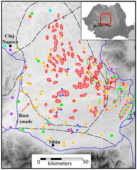 Distribution of seeps in the Transylvanian Basin in relation to the gas commercial deposits (red pattern), major faults (black dashed lines), anticlines (red dashed lines), synclines (green dashed lines), after [38,54]. Symbols of the seeps are the same as in Figure 2.