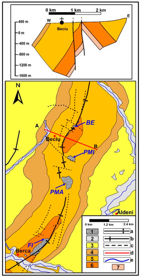 Geological map and cross-section A-B on the Berca-Arbanasi hydrocarbon-bearing structure, showing the position of the mud volcanoes in relation to tectonic structures. 1: mud volcanoes; 2: alluvial sediments; 3: Romanian; 4: Dacian; 5: Pontian; 6: Meotian; 7: middle Miocene; a: anticline; b: syncline; c: fault; d: transect; e: river; BE: Beciu; PMI: Paclele Mici; PMA: Paclele Mari; FI: Fierbatori (modified after [30]).