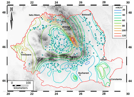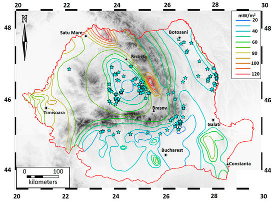 The current heat flow in the Carpathian Flysch and Foredeep areas is around 40–60 mW m−2, with some exceptions at the limit between the Southern Carpathian Foredeep and the Moesian Platform, where it may drop down to 20–30 mW m−2. In the Moldavian Platform the heat flow is about 40–50 mW m−2, with a slight increasing tendency from West to East [47].