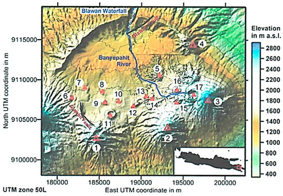 Digital elevation model of the Ijen caldera complex. Red triangles indicate post-caldera volcanoes: 1: Jampit; 2: Ranteh; 3: Merapi; 4: Ringgih; 5: Blau; 6: Cemara; 7: Melaten; 8: Lingker; 9: Anyar; 10: Genteng; 11: Pendil; 12: Gelawan; 13: Kukusan; 14: Telaga Weru; 15: Widodaren; 16: Papak; 17: Kawah Ijen [9].
