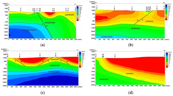 Our final 2D models created using WinGlink, developed by Schlumberger, along profile A1–A2, profile B1–B2, profile C1–C2, and profile D1–D2 are shown in in Figure 5. The 2D model of profile A1–A2 (Figure 5a) achieved a normalized r.m.s. (root mean square) misfit of 4.455% after 136 iterations. The 2D model of profile B1–B2 (Figure 5b) achieved a normalized r.m.s. (root mean square) misfit of 3.005% after 152 iterations. The 2D models of profile C1–C2 shown in (Figure 5c) achieved a normalized r.m.s misfit of 3.788% after 154 iterations. Finally, Figure 5d presents the 2D model of profile D1–D2 which achieved a normalized r.m.s. misfit of 1.967% after 164 iterations.