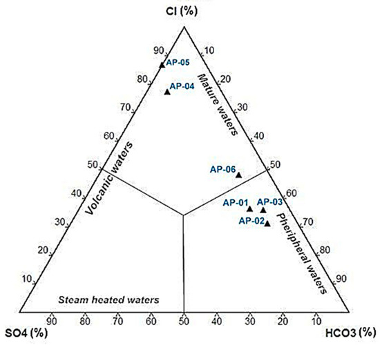 Ternary diagram of Cl-SO4-HCO3 for the Blawan hotspring sites [21].