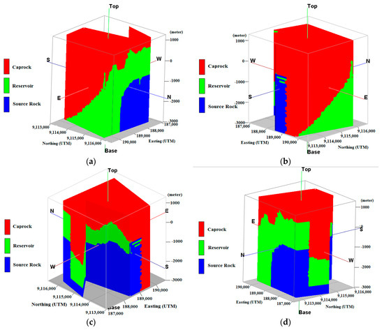 3D model of the Blawan reservoir showed from (a) north-east, (b) south-east, (c) south-west, and (d) north-west. The low resistivity zone (≤32 Ω·m) covers the surface of the study area and thickens towards east (red zone). A medium resistivity zone (>32–≤512 Ω·m) is marked in green area and indicates a reservoir where there is accumulation of hot fluid. The blue area is a high resistivity zone (>512 Ω·m) and it shows indications of the presence of a fault with the orientation of the Blawan fault.