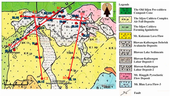Based on the correlation with the geological map of research area (Figure 8), it can be interpreted that the low resistivity zone (≤32 Ω·m) is probably composed of sandstone, Blawan lake sediments, and pyroclastic deposits such as volcanic ash. The low resistivity zone dominates to depths of 750 m below sea level and thickens toward the west (spread out along A1–A2). In Profile 2 (spread out along B1–B2), the low resistivity zone dominates from the surface to a depth of 1250 m below sea level. This corresponds to the geological map (Figure 8) that shows the presence of the Blawan fault. For Profile 3 (C1–C2) the low resistivity zone is significantly shallower than in Profiles 1 and 2, and extends from the surface to a depth of 250 m. In Profile 4 (D1–D4) the low resistivity zone thickens towards point BL-16 (in the south) to a depth of 1000 m below sea level. Low resistivity is often associated with hydrothermal alteration processes, and resistivity decreases proportionately with the abundance of clay minerals. In general, the conductive clay products of hydrothermal alteration, and the high temperature associated with geothermal activity tend to result in lower overall resistivity in geothermal systems [27]. We interpret our low resistivity zones as due to caprock with the presence of high clay mineral contents. Caprock is composed of impermeable rocks that prevent hot fluid in the reservoir being lost to the surface. The low resistivity zone is suspected to be formed in post-caldera period.